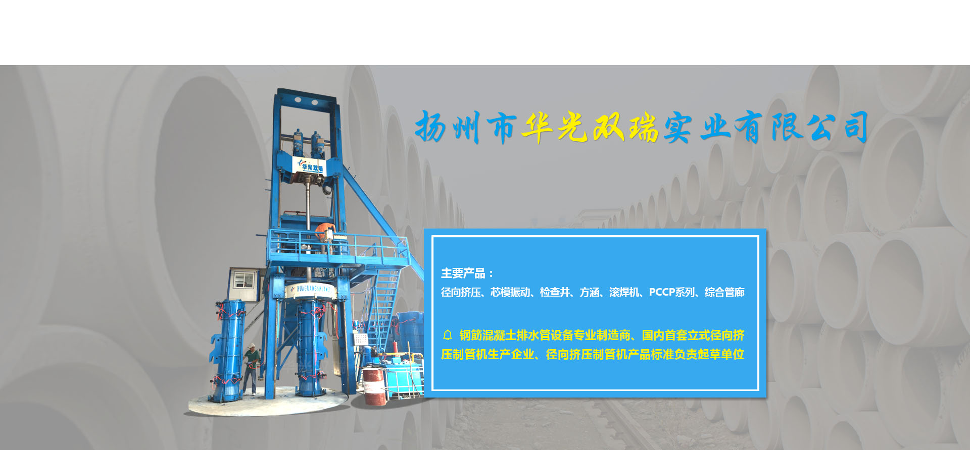 ????????揚(yáng)州市華光雙瑞實(shí)業(yè)有限公司,位于中國歷史文化名城揚(yáng)州市東郊江都區(qū)丁伙工業(yè)園區(qū),公司成立于2000年10月,是一家專門致力于鋼筋混凝土排水管生產(chǎn)裝備的設(shè)計(jì)開發(fā)、加工制造、銷售服務(wù)的專業(yè)制造商。公司2016年度被授予全國建材機(jī)械產(chǎn)品定點(diǎn)生產(chǎn)企業(yè),2017年度被授予中國混凝土與水泥制品協(xié)會會員單位,江蘇省認(rèn)定企業(yè)技術(shù)中心,江蘇省研究生工作站,揚(yáng)州市水泥制品工程技術(shù)研究中心,先后承擔(dān)過國家火炬計(jì)劃項(xiàng)目一項(xiàng),省科技項(xiàng)目二項(xiàng),揚(yáng)州市重點(diǎn)研發(fā)項(xiàng)目一項(xiàng)。公司擁有自主知識產(chǎn)權(quán)36項(xiàng)(發(fā)明專利6項(xiàng),實(shí)用新型專利30項(xiàng)),公司研發(fā)的13種產(chǎn)品榮獲江蘇省高新技術(shù)產(chǎn)品稱號。公司產(chǎn)品有立式徑向擠壓制管機(jī)系列、芯模振動(dòng)制管機(jī)系列、檢查井系列、方涵系列、自動(dòng)變徑滾焊機(jī)系列、PCCP系列、綜合管廊系列。核心產(chǎn)品立式徑向擠壓機(jī)2014年度榮獲混凝土與水泥制品行業(yè)技術(shù)革新一等獎(jiǎng),2015年度獲江蘇省機(jī)械工業(yè)科技進(jìn)步二等獎(jiǎng),2016年度獲全國建材行業(yè)技術(shù)革新一等獎(jiǎng),預(yù)制混凝土檢查井生產(chǎn)線榮獲混凝土與水泥制品行業(yè)2017年度技術(shù)革新二等獎(jiǎng),2011年度立式水泥制管成型機(jī)獲混凝土與水泥制品行業(yè)技術(shù)革新三等獎(jiǎng)。公司還是國內(nèi)首套立式徑向擠壓制管機(jī)的生產(chǎn)企業(yè),該產(chǎn)品2012年起填補(bǔ)了國內(nèi)同類產(chǎn)品的空白,公司2013年被國家建筑材料工業(yè)機(jī)械標(biāo)準(zhǔn)技術(shù)委員會批準(zhǔn)為《鋼筋混凝土排水管 芯模振動(dòng)制管機(jī)》《水泥制品用鋼筋混凝土管排水管鋼筋骨架滾焊機(jī)》的行業(yè)標(biāo)準(zhǔn)制定單位,2017年11月被國家建筑材料工業(yè)機(jī)械標(biāo)準(zhǔn)技術(shù)委員會批...